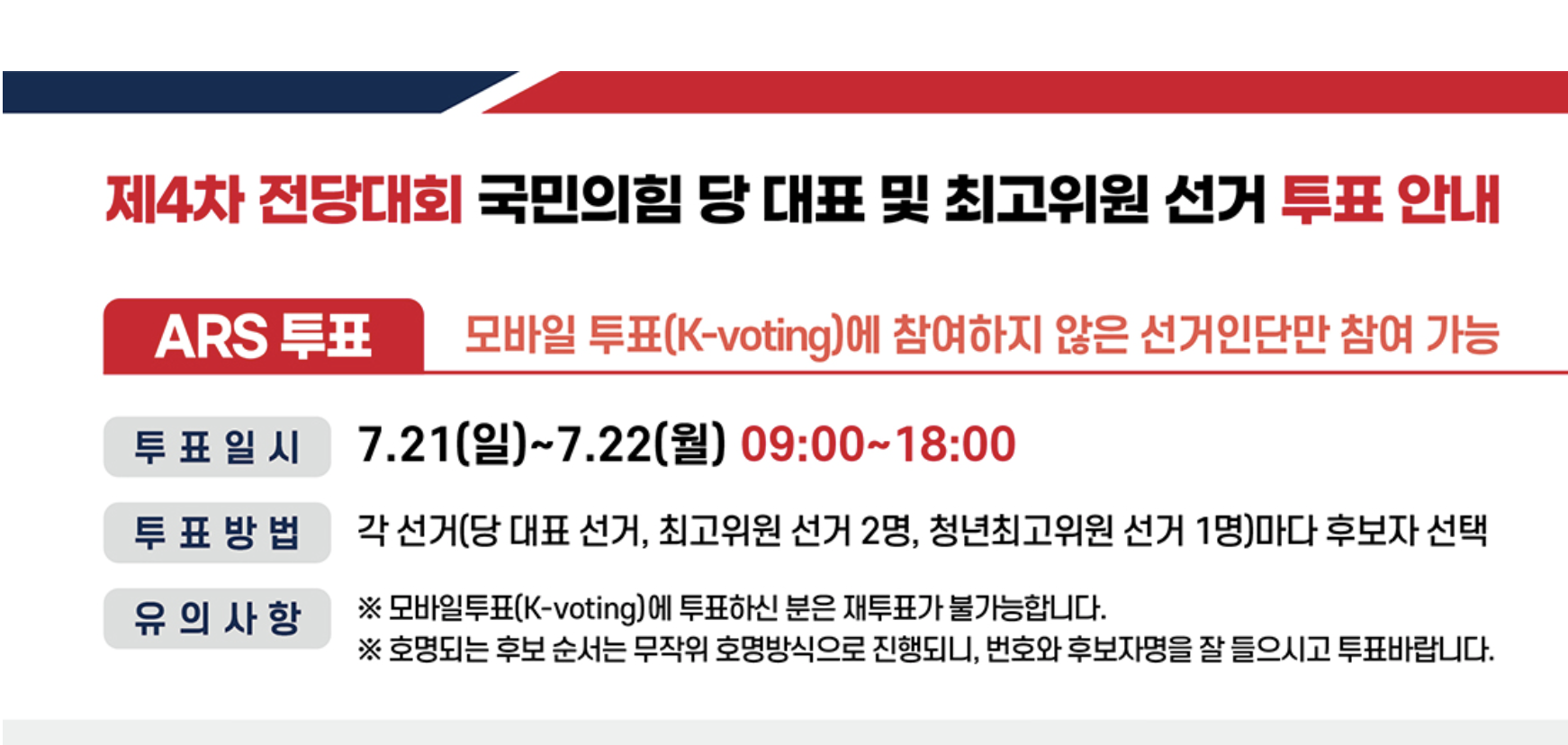 ARS 투표는 모바일 투표에 참여하지 않은 선거인단만 가능하며, 일시는 7월 21일부터 22일 오전 9시부터 18시까지입니다. 투표방법은 각 선거마다 후보자를 선택하면 되는데요. 유의사항으로는 호명되는 후보의 순서가 무작위이기 때문에 번호와 후보자명을 잘 ㄷ르은 후에 투표를 해야한다고해요.