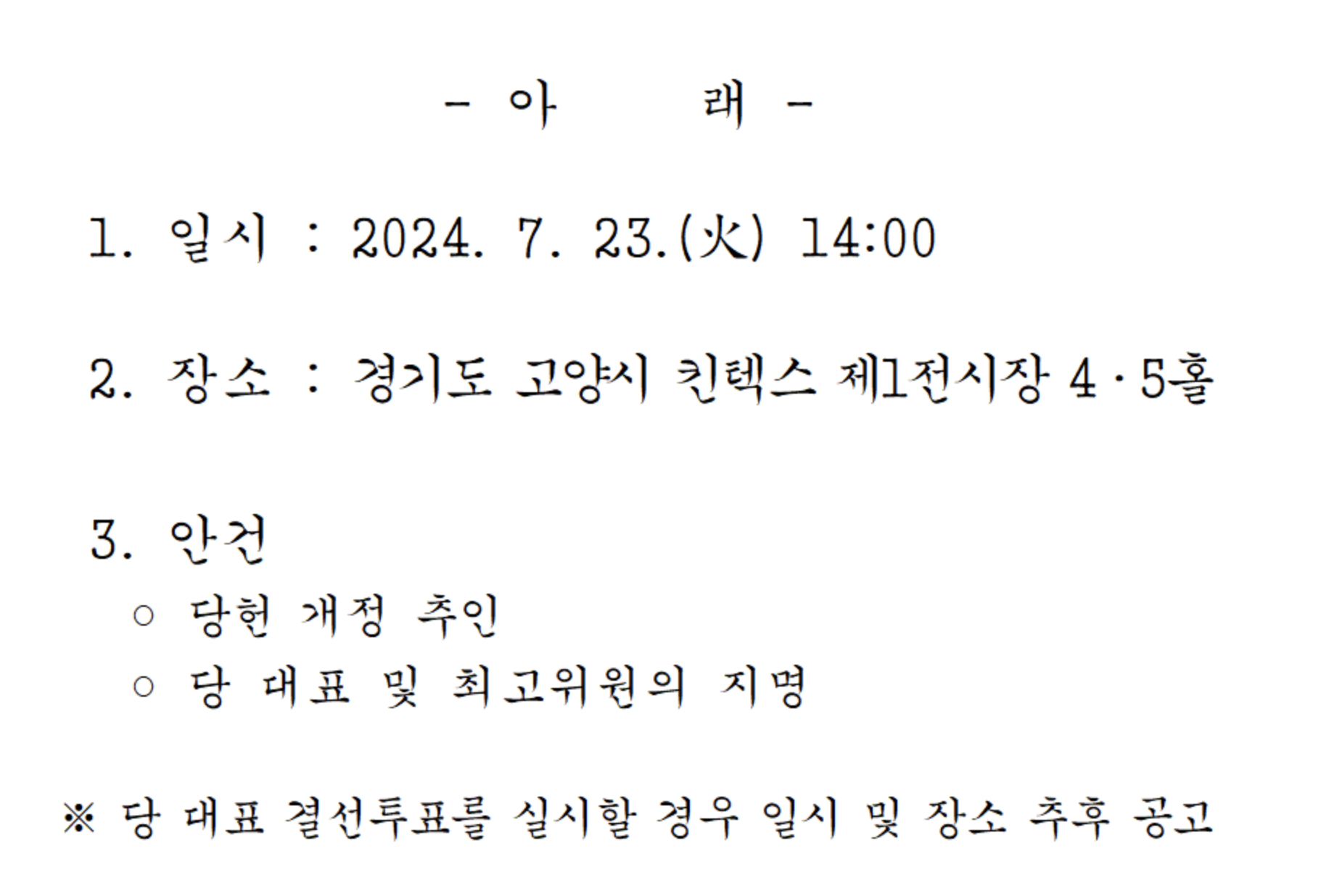 마지막으로 국민의힘 전당대회 장소에 대해서 알아볼텐데요. 장소는 경기도 고양시 킨텍스 제1전시장 4, 5홀이라고 합니다. 국민의힘 전당대회 시간은 7월 23일 14시에 진행이 된다고해요. 만약 당 대표 결선투표를 실시하게 될 경우에는 일시 및 장소를 추후에 공지한다고 하니 참고하시길 바랍니다.