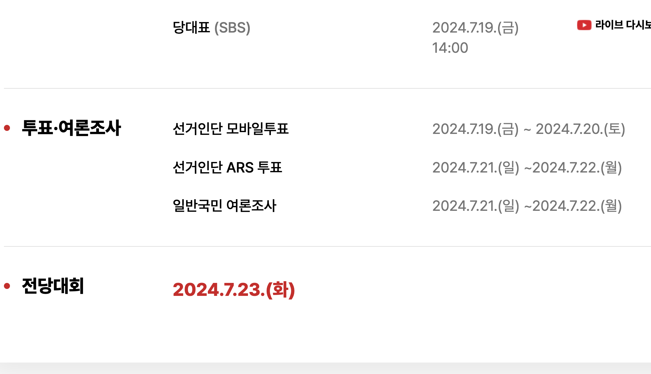 여기까지가 국민의힘 전당대회의 일정입니다. 현재는 ARS투표와 일반국민 여론조사, 그리고 내일 있을 전당대회만 남아있고 그 외 일정은 모두 끝이난 상황이에요.