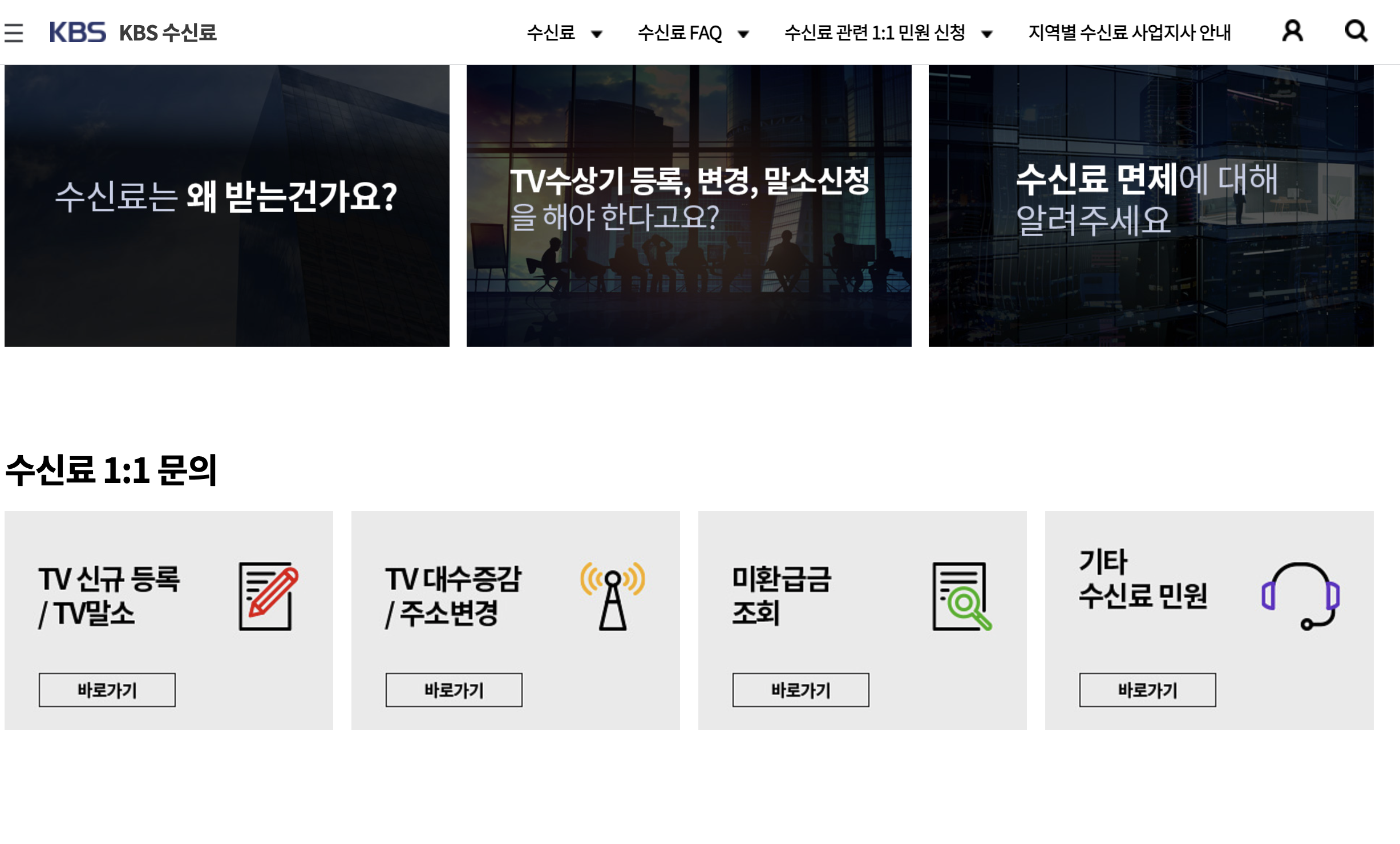 그럴 때에는 kbs 홈페이지에 접속하면 됩니다. 그러면 메뉴에 수신료가 따로 있는데요. 이곳에 수신료 1:1 문의란이 있습니다. 로그인을 한 후에 해당 문의란에 문의를 하는 것이 빠른 방법일수도 있습니다.