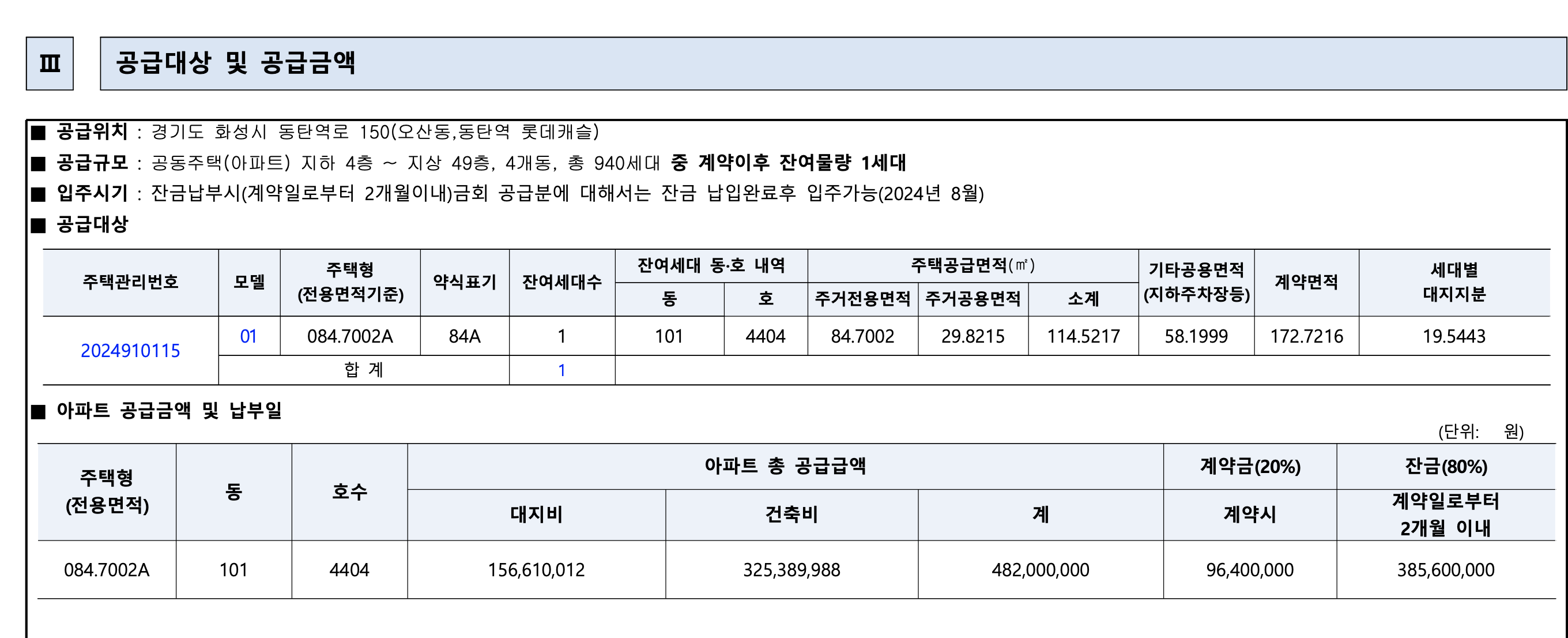 - 공급규모 : 공동주택(아파트) 지하 4층 ~ 지상 49층, 4개동, 총 940세대 중 계약 이후 잔여물량 1세대