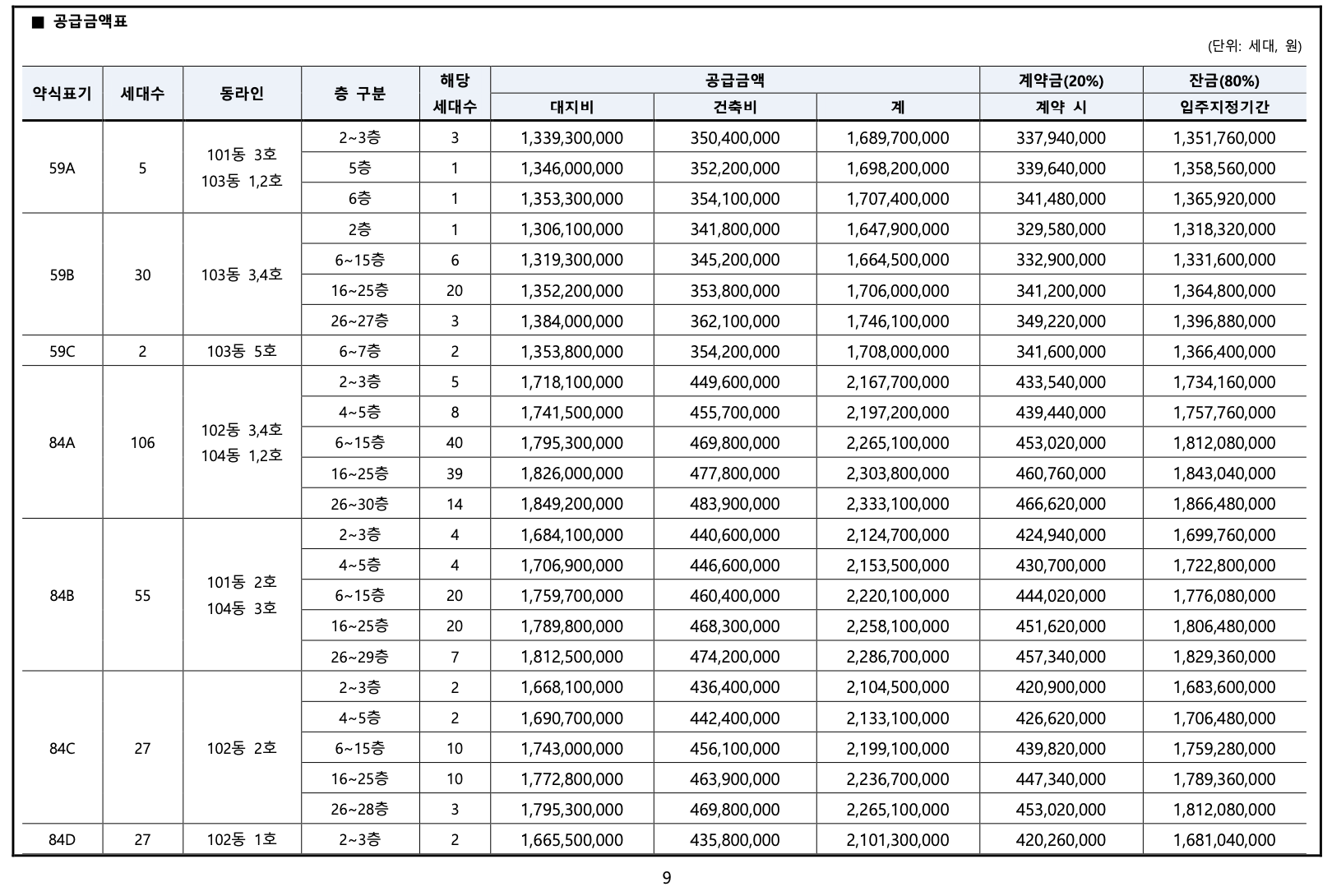 반포 래미안 원펜타스 분양가도 알아보겠습니다. 59A, 59B, 59C는 1,689,700,000원 ~ 1,746,100,000원 사이 입니다. 84A~84D, 107A,B 분양가는 20억대이며, 137A, B는 30억대, 155 40억대, 191은 50억대 입니다.